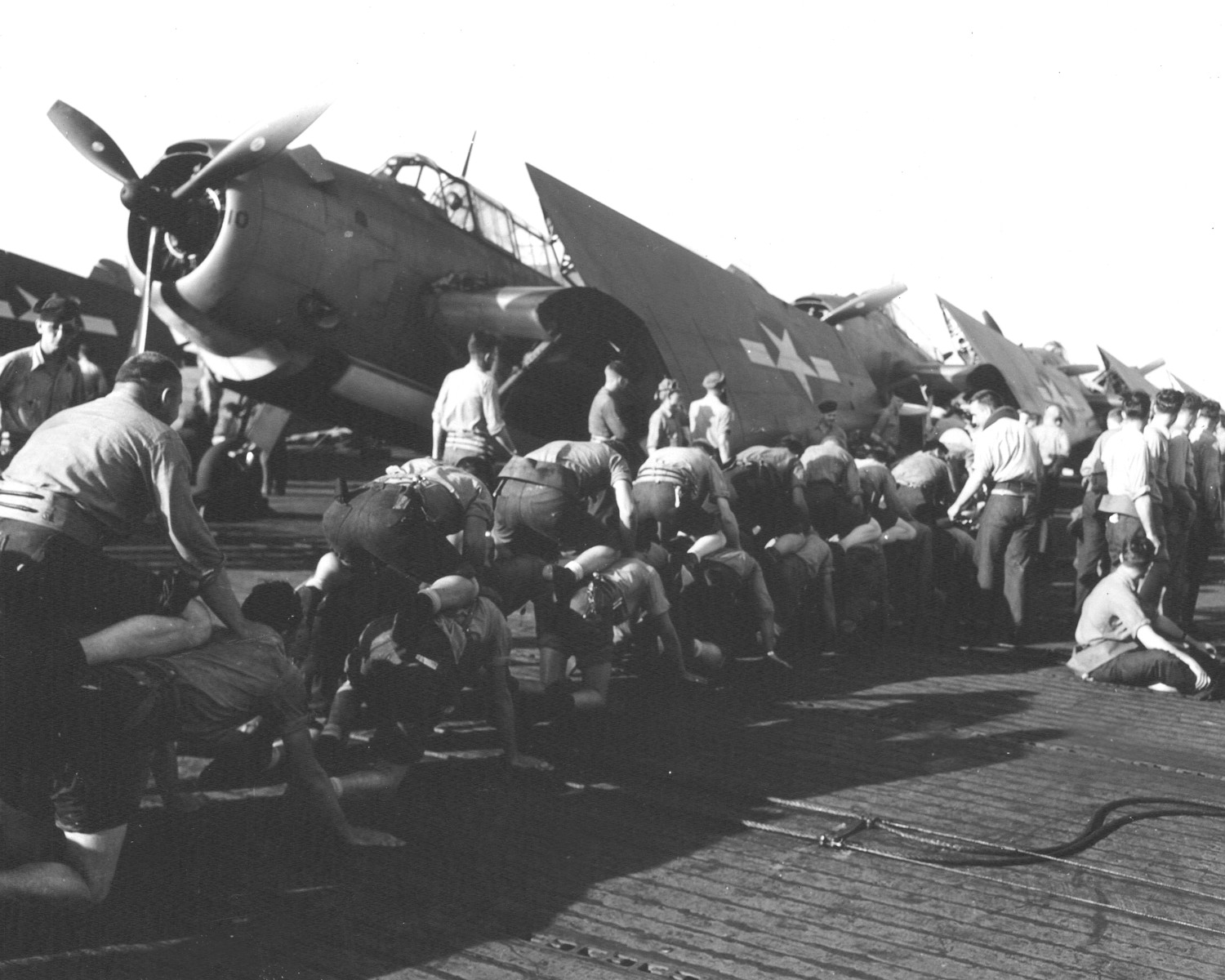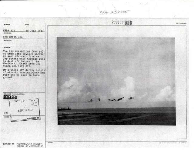 100k | "The USS Corregidor (CVE-58) of Task Unit 52.11.2 throws up anti aircraft fire as Jap planes make torpedo runs at dusk off Saipan I. in Marianas. Taken from USS Coral Sea (CVE-57)." "FM-2 takes off during heighth [sic] of attack: Burning plane and fire can be seen in background." Photo # CRLS 319, dated 18 June 1944. National Archives photo (# 80-G-238305). |