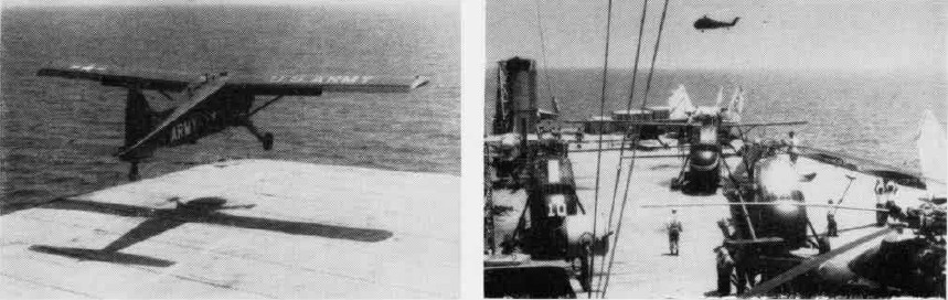 83k | Two photos of the utility aircraft carrier USNS Corregidor (T-CVU 58) in July 1958 off Lebanon in the Mediterranean Sea. The left hand pic shows a U.S. Army L-20 Beaver as it takes off from Corregidor's flight deck, and the right hand pic shows U.S. Army H-34 Choctaws ready for lift off. When the Lebanon crisis broke in the summer of 1958, Corregidor was at Brindisi, Italy, and immediately lifted two U.S. Army De Havilland Canada L-20 Beaver reconnaissance planes of the 24th Infantry Division, and 10 Sikorsky H‑34 Choctaw helicopters to support the landings. U.S. Navy Naval Aviation News magazine, October 1958 issue. |
