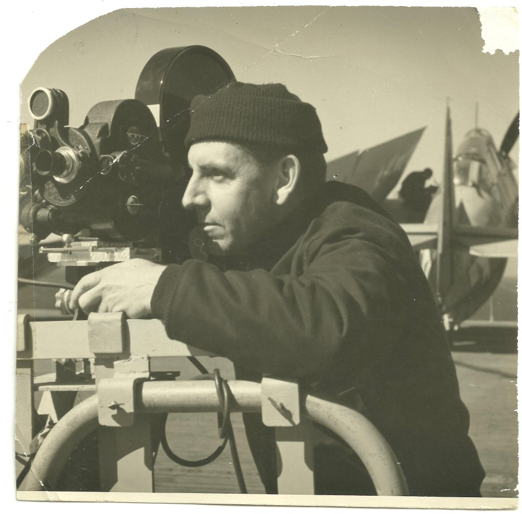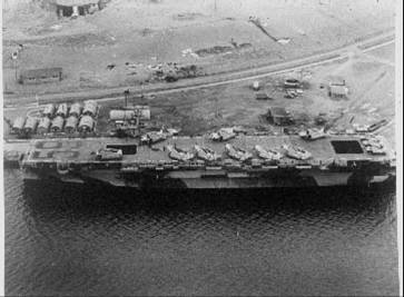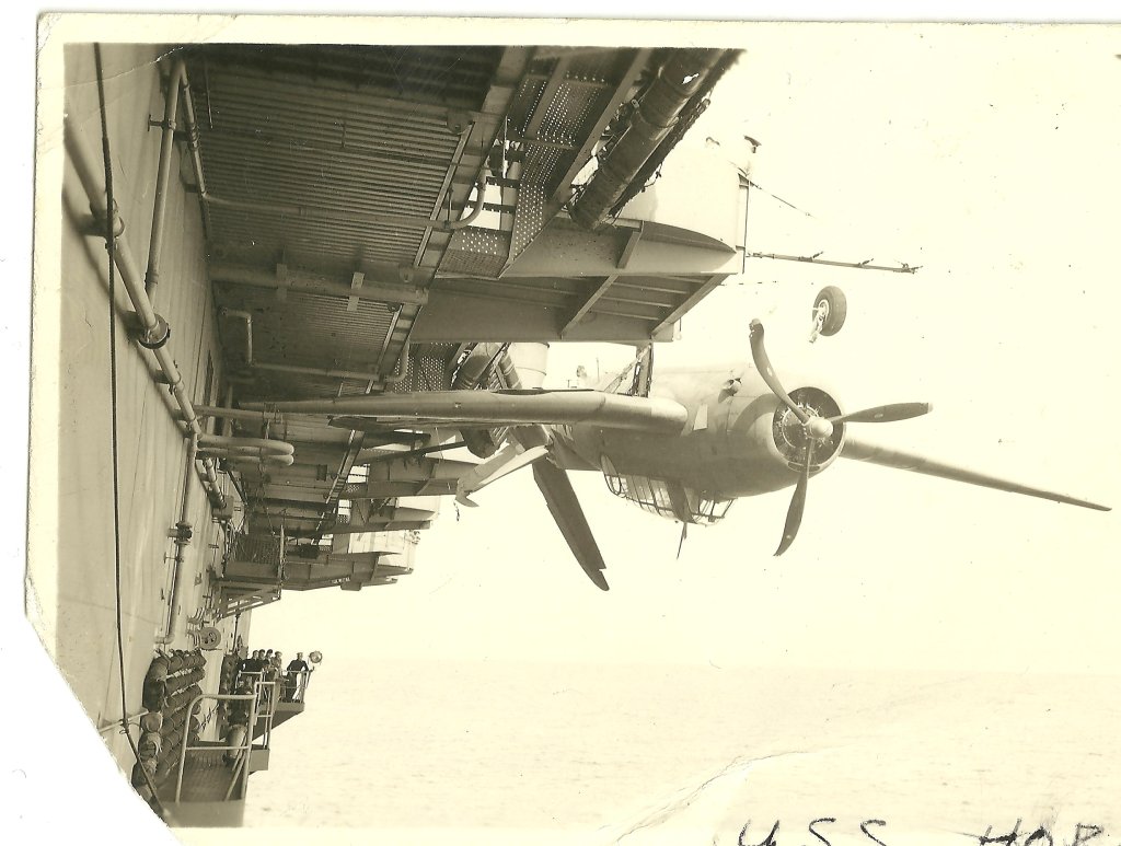 120k | Charles Parkhurst was an Aerial Photographer aboard the first USS Hornet (CV-8) up to her sinking, then aboard USS Baffins (CVE-35), and finally aboard USS Mision Bay (CVE-59), where these two photos from his collection would have been taken. (Special thanks to Robert M. Cieri, who scanned the original photographs.) |