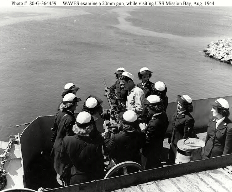 344k | Several WAVES examine a 20mm anti-aircraft machine gun, while visiting USS Mission Bay (CVE-59) on 20 August 1944. Official U.S. Navy Photograph, now in the collections of the National Archives (# 80-G-364459). |