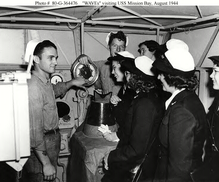 362k | WAVES visit USS Mission Bay (CVE-59), 20 August 1944. In this view, they are receiving a tour of the ship's pilothouse from two of her crewmen. Official U.S. Navy Photograph, now in the collections of the National Archives (# 80-G-364476). |