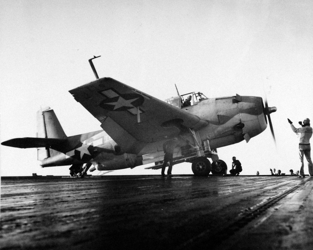 105k | TBF Avenger with rocket bombs in rack ready to be catapulted from USS Mission Bay (CVE-59), 26 November 1943. National Archives & Records Administration (NARA), photo # 80-G-242083. |