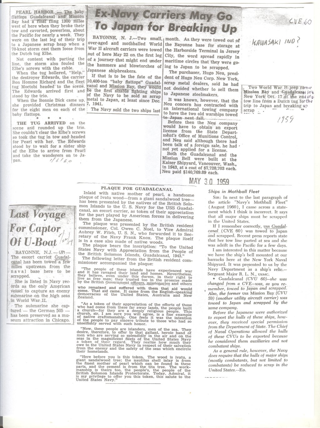 341k | "Ex-Navy Carriers [Guadalcanal and Mission Bay] May Go To Japan for Breaking Up." |