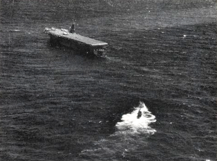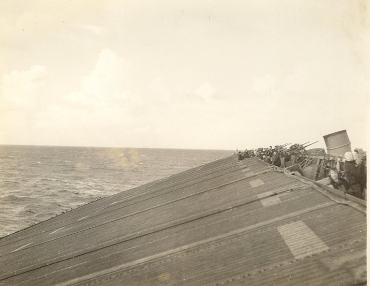 51k | USS Guadalcanal (CVE-60). View from the flight deck, in a steep turn. Photo by James Cox Davis, who was aboard at the time of the capture of U-505. |