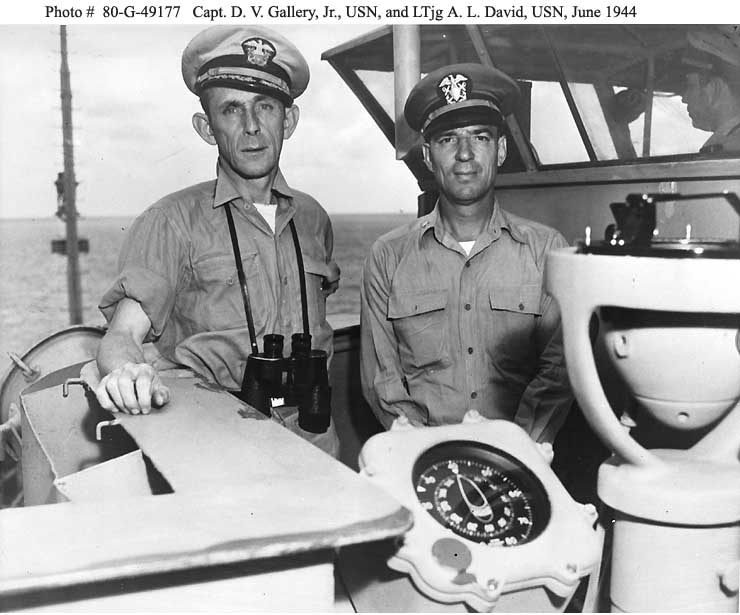 57k | Captain Daniel V. Gallery, Jr., USN (left) and Lieutenant Junior Grade Albert L. David, USN photographed aboard USS Guadalcanal (CVE-60) in June 1944. On 4 June 1944 LT(JG) David led the boarding party that took control of the German submarine U-505 after it was forced to surface by Guadalcanal's task force. This capture of an enemy warship on the high seas was the first by the U.S. Navy since 1815. Albert David, who died on 17 September 1945, was posthumously awarded the Medal of Honor for his leadership and bravery during this action. USS Gallery (FFG-26) was named after RADM Daniel Vincent Gallery and his brothers, RADM William Onahan Gallery and RADM Philip Daly Gallery. USS Albert David (DE-1050, later FF-1050) was named after LT Albert Leroy David. Official U.S. Navy Photograph, now in the collections of the National Archives (# 80-G-49177). |