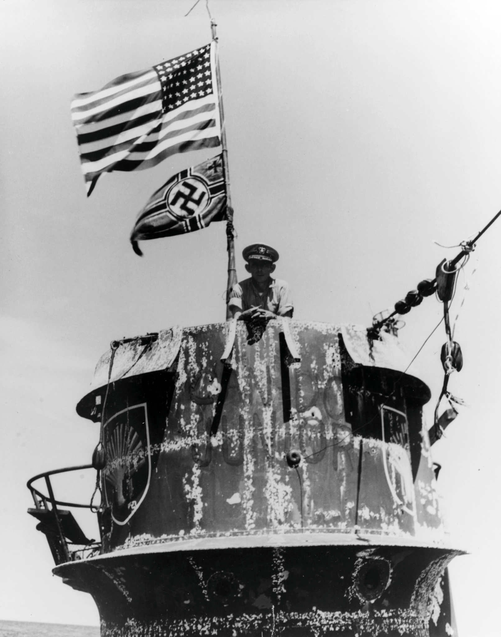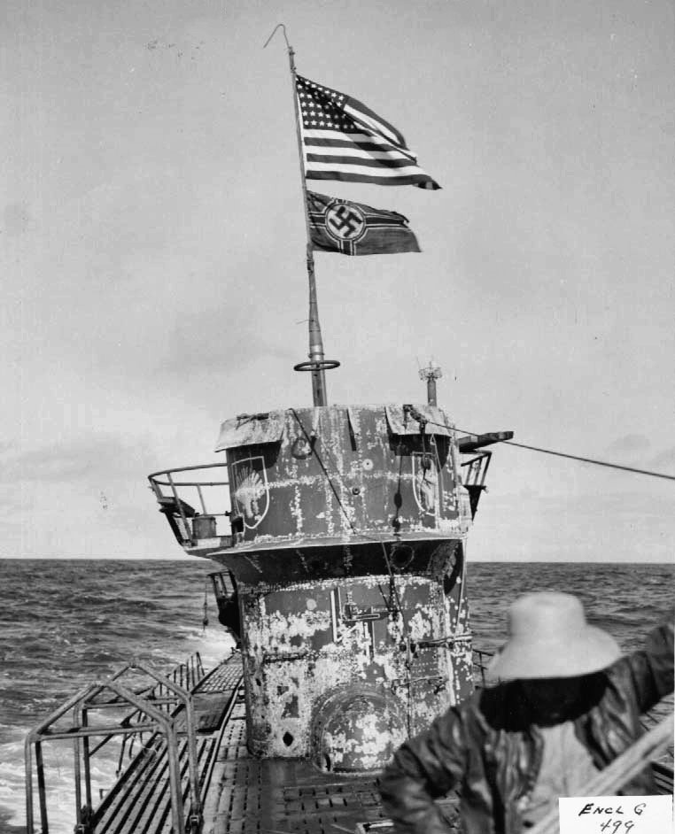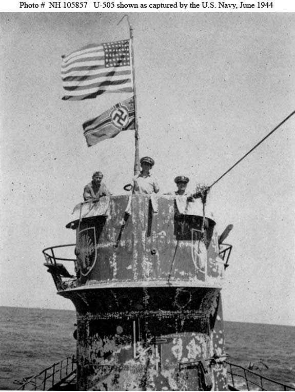 82k | Halftone reproduction of a photograph taken soon after U-505's capture (4 June 1944), copied from the "USS Guadalcanal (CVE-60) Memory Log, " page 28. U.S. Naval Officers shown on the submarine's conning tower are, from left to right: Commander Earl Trosino, USNR; Captain Daniel V. Gallery, Jr., USN, Commanding Officer, USS Guadalcanal; and Lieutenant Junior Grade Albert L. David, USN, who was posthumously awarded the Medal of Honor for leading the boarding party that captured the submarine and carried out initial salvage operations. Note the United States flag flying above the German Navy ensign. U-505 was the first enemy warship captured on the high seas by the U.S. Navy since 1815. Courtesy of the Naval Historical Foundation, Washington, DC. Naval History & Heritage Command photo (# NH 105857). |