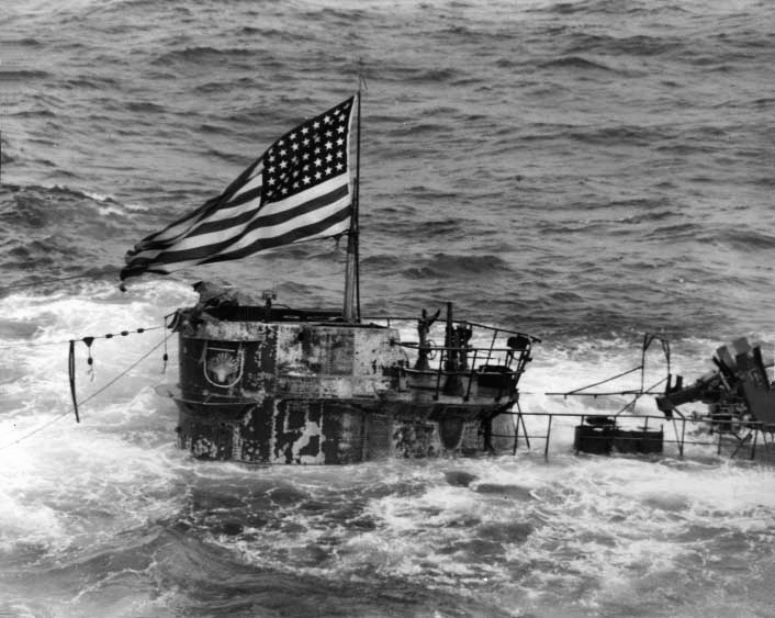 244k | U.S. Colors fly over captured U-505. Note U-505's emblem, a seashell, painted on the sail. |