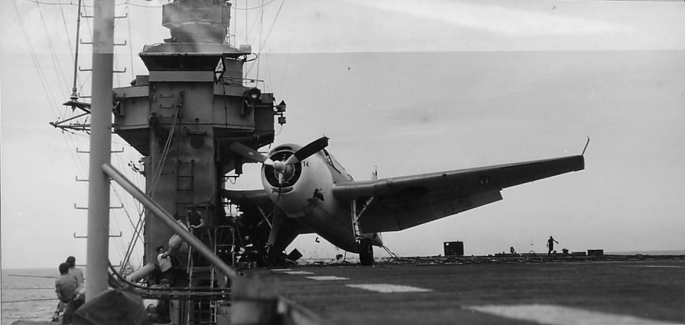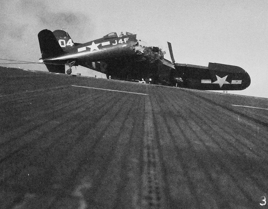 1001k | Crash of an F4U Corsair into catwalk aboard USS Guadalcanal (CVE-60), 5 April 1945. National Archives and Records Administration (NARA) photo, # 80-G-383978. |