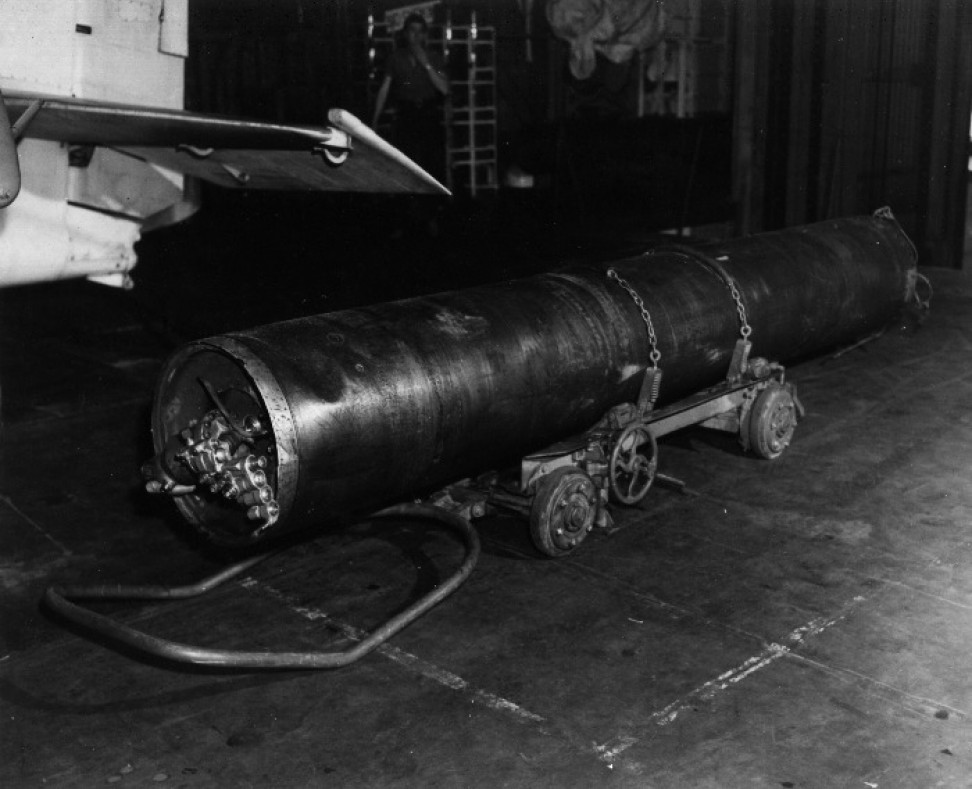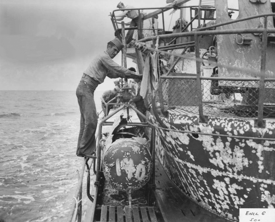 56k | German submarine U-68, Type IXC, was sunk with machine gun fire, rockets and depth bombs by two TBF/TBM-1C Avengers—LT S.G. Parsons (plane # 24), and LT H.E. Hoerner (# 22)—and one FM-2 Wildcat—LCDR Richard K. Gould (# 4)—from VC-58, operating off USS Guadalcanal (CVE-60). Date was 10 April 1944, position 33°24'N, 18°59'W (mid-Atlantic, northwest of Madeira). Fifty-six German sailors perished, and a single survivor was rescued by USS Chatelain (DE-149). NS0306028: Damage to the underside of the starboard wing of LT(JG) Parsons's aircraft, caused by U-68's anti-aircraft fire. NS0306028a: Air flask from one of U-68's torpedoes, in the hangar bay of Guadalcanal. |