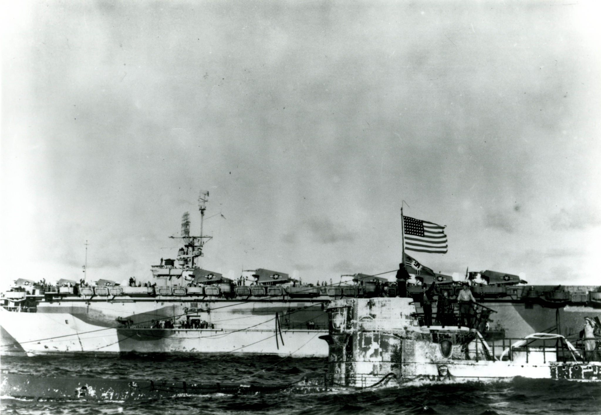 574k | Captain Daniel V. Gallery and Commander Johnson shown aboard USS Guadalcanal (CVE-60), 6 July 1944. Note, the five Nazi flags National Archives and Records Administration (NARA) photo, # 80-G-383997. |