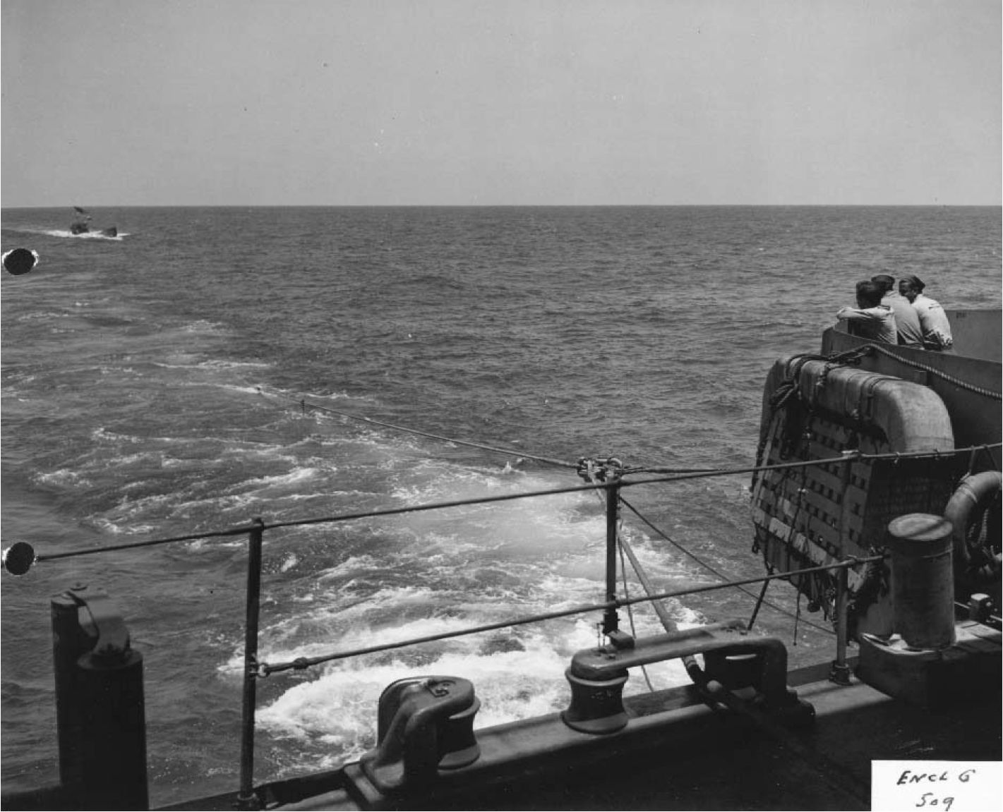 96k | Splashes are from ENS McLane's first two pairs of rockets. McLane continued inbound firing his third and last pair of rockets and releasing two depth bombs. |
