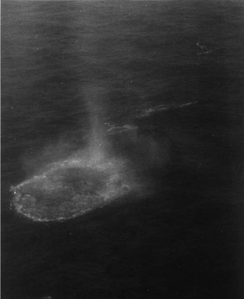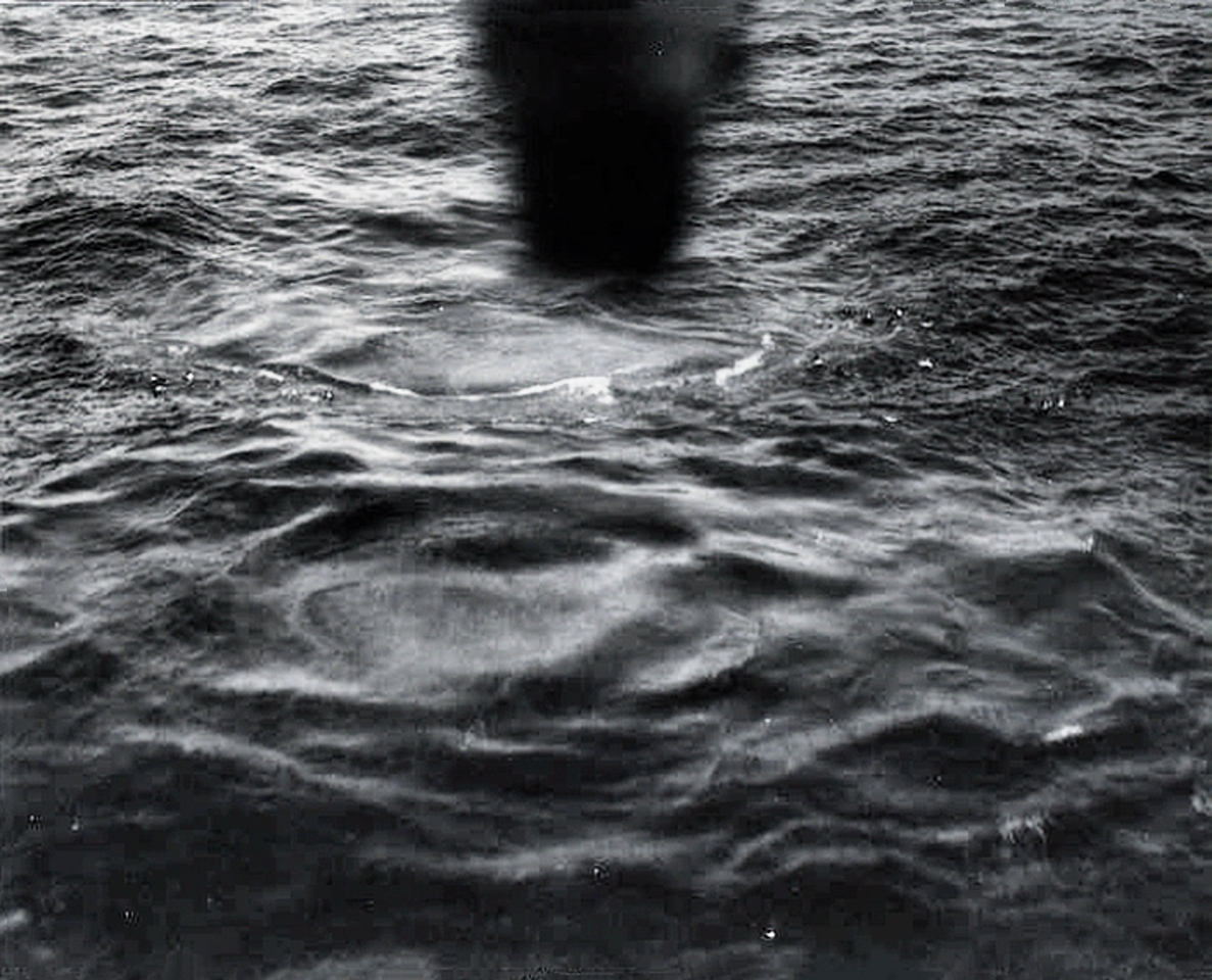 52k | The depth bomb (DB) swirl and subsiding spray on the left is from ENS Hudson's attack on U-129 and U-544, which were refueling side by side. The DBs straddled U-129, that submerged immediately and escaped. Close on ENS Hudson's heels, ENS William M. McLane attacked with rockets and Mk.47 DBs. U-544 can be seen to the right. (See also NS0306420.) |
