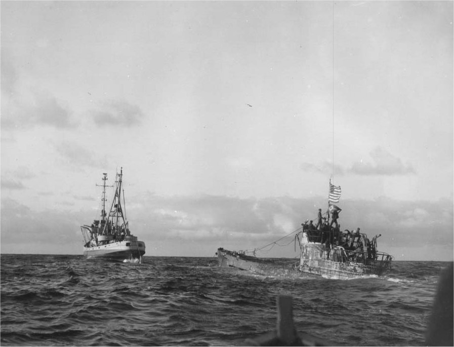 76k | USS Abnaki (ATF-96), left; captured German submarine U-505, center; and covered lighter YFN-275, moored at Bermuda, 19–29 June 1944. |