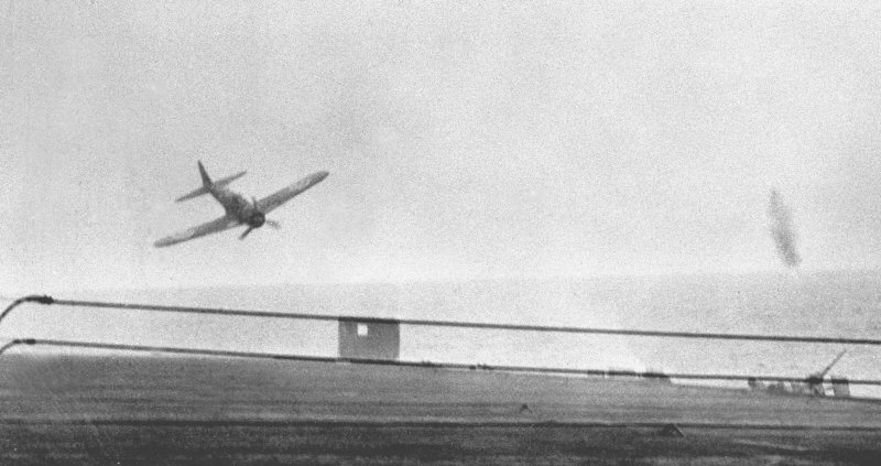 65k | This kamikaze (a Zeke fighter) apparently "expected to land on the after end of the flight deck." CAPT Sullivan, White Plains commanding officer, avoided a direct hit by ordering a hard turn to starboard: the plane and its bomb exploded just off the port side of the carrier and caused only minor damage; eleven men were injured, none seriously. |