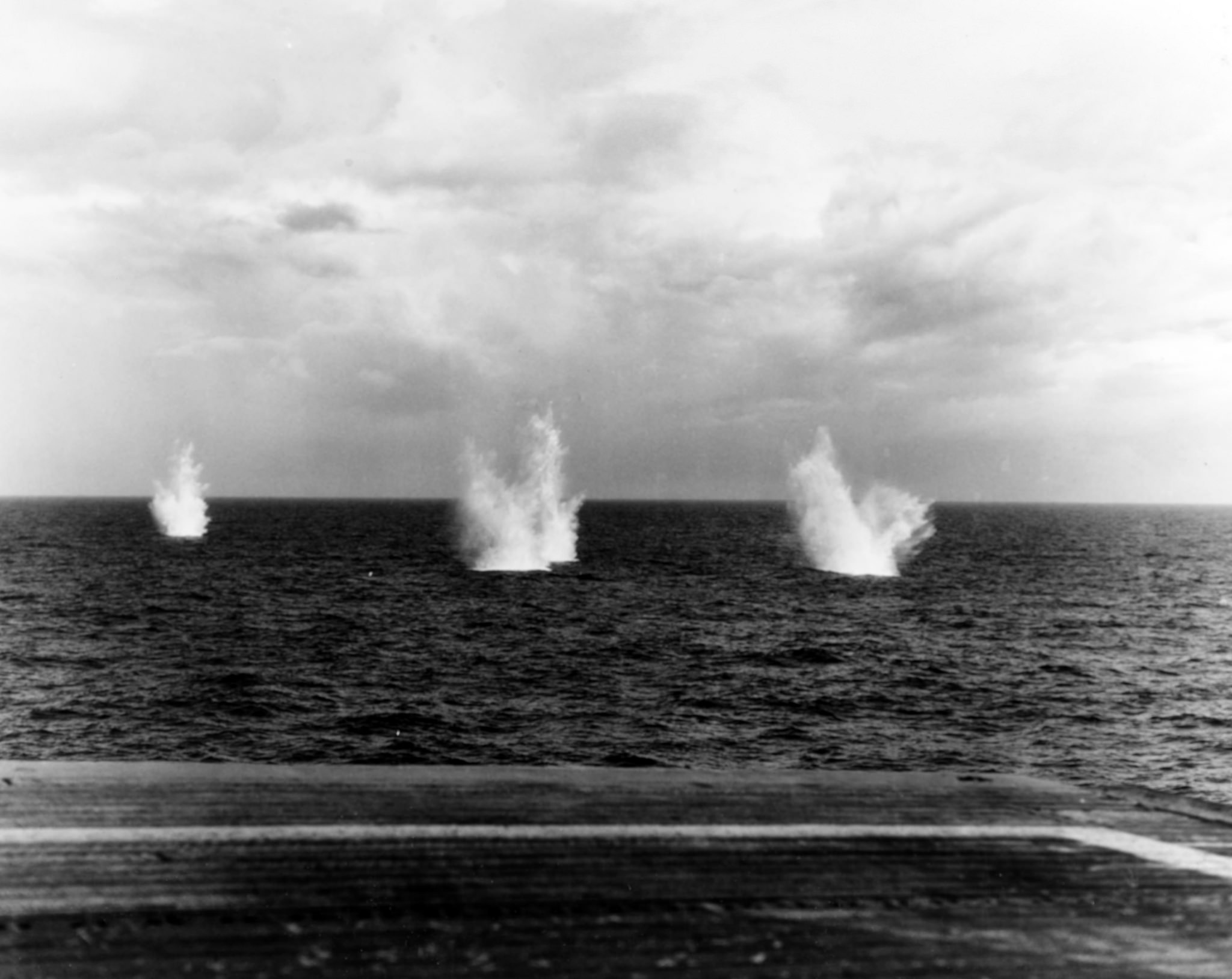 274k | Battle of Leyte Gulf, Battle off Samar, 25 October 1944. Splashes from Japanese shells near USS White Plains (CVE-66) during the Japanese fleet's attack on Carrier Division 25. Official U.S. Navy Photograph, now in the collections of the National Archives and Records Administration (NARA), #80-G-288886. |