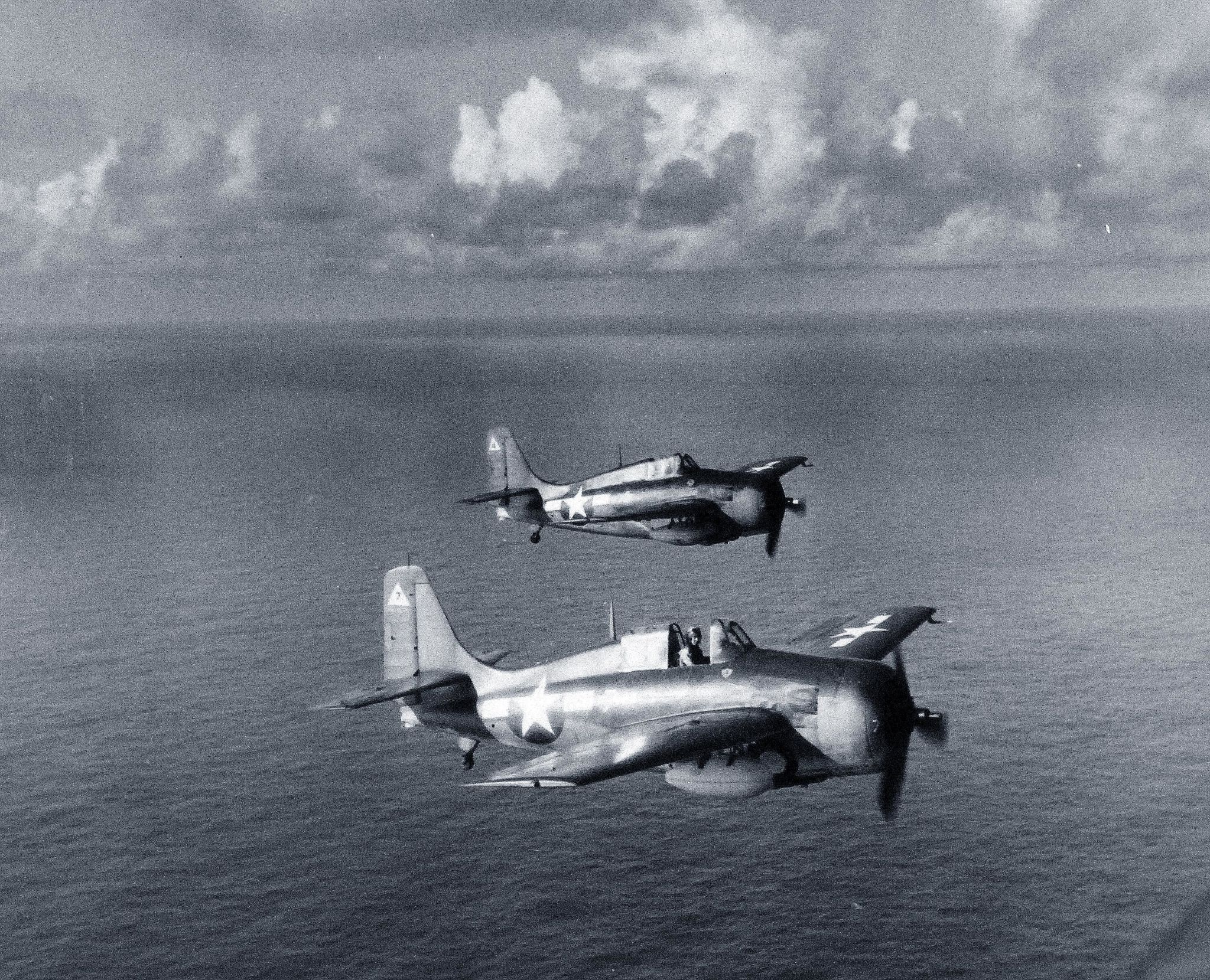 1.11M | General Motors FM-2 Wildcat fighters from USS White Plains (CVE-66) fly an escort mission, probably during air strikes on Japanese facilities on Rota Island, Marianas, 24 June 1944. Note island in the distance. Official U.S. Navy Photograph, now in the collections of the National Archives and Records Administration (NARA), # 80-G-384058. |