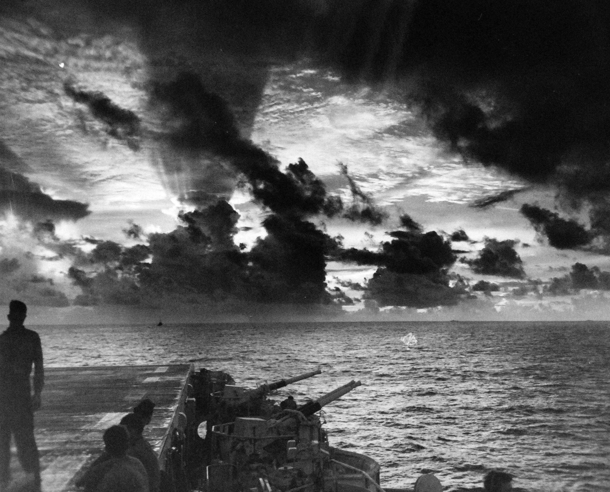855k | Spectacular sunrise as seen from USS White Plains (CVE-66), 20 June 1944. Official U.S. Navy Photograph, now in the collections of the National Archives and Records Administration (NARA), # 80-G-384135. |
