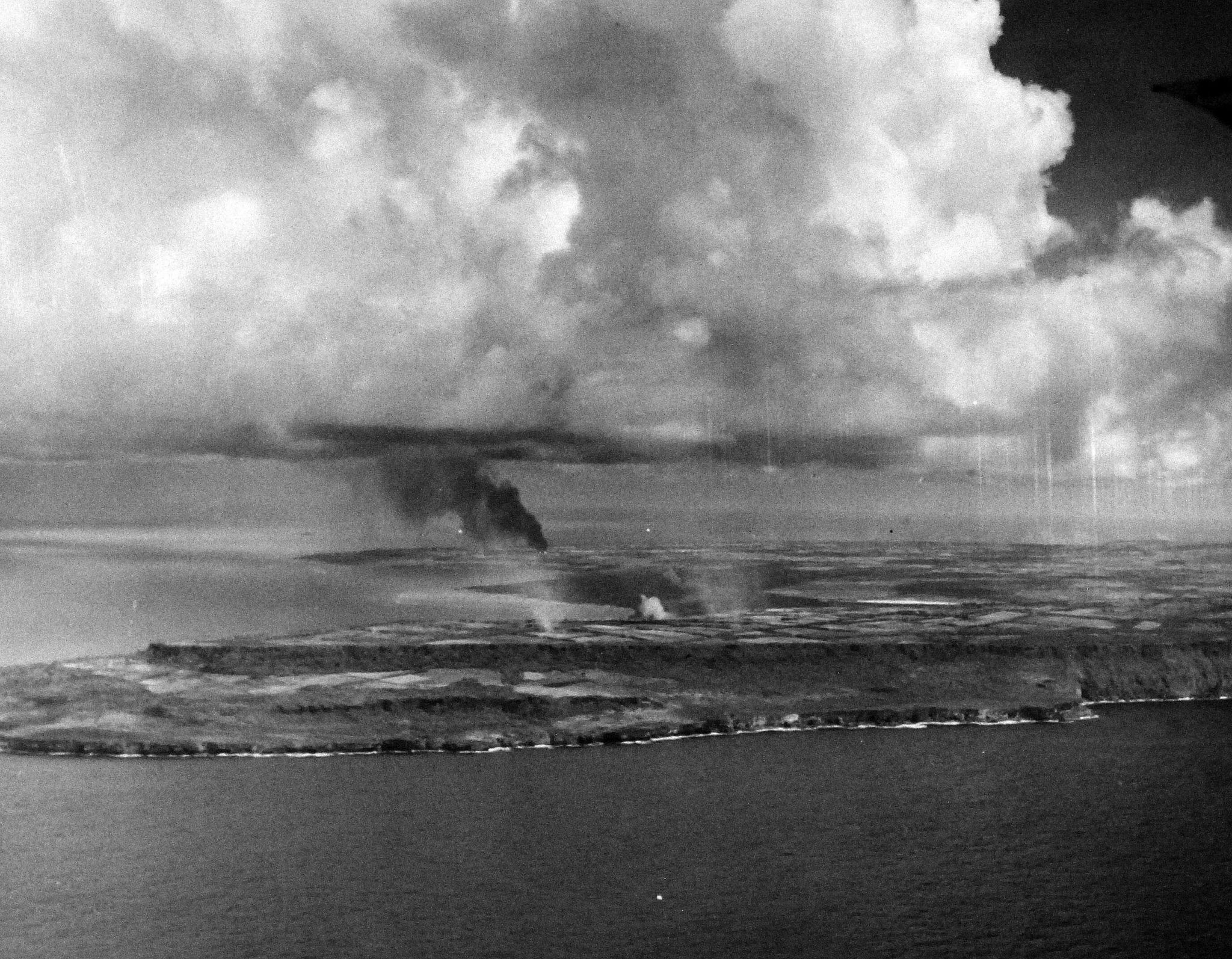 693k | Bombing of Tinian Island, taken by plane from USS White Plains (CVE-66), 25 July 1944. National Archives and Records Administration (NARA), # 80-G-384179. |