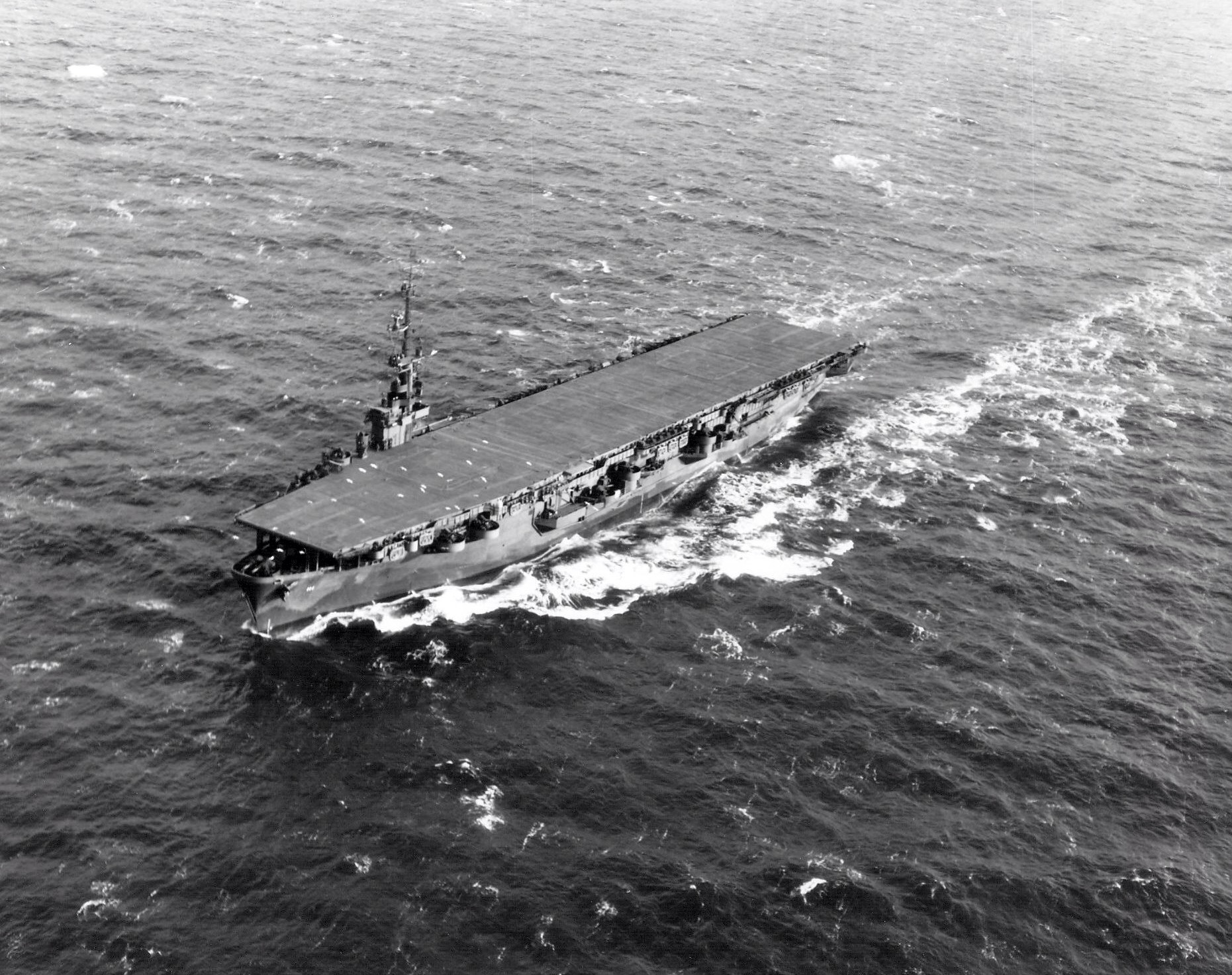702k | Overhead view of USS Vella Gulf (CVE-111) underway on 25 August 1945. The ship was heading to Japan where she would, along with USS Gilbert Islands (CVE-107), provide food, fuel and air cover for fleet units operating off the coast of Japan. National Naval Aviation Museum, Robert L. Lawson Photograph Collection, # 1996.488.035.015. |