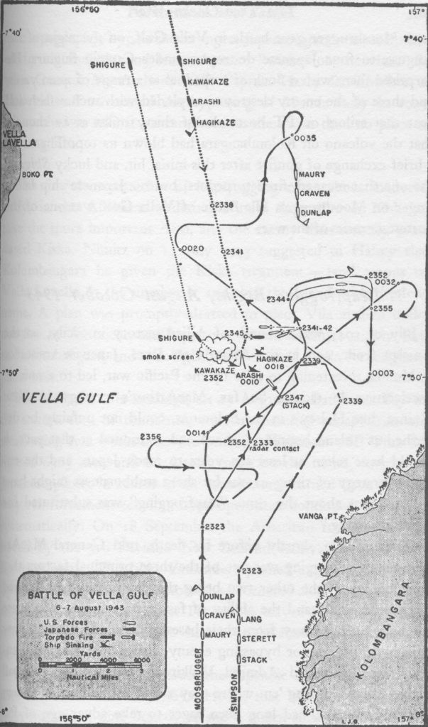 122k | CVE-111 was initially named Totem Bay for a bay on the southern shore of Kupreanof Island, Alexander Archipelago, in the southern panhandle of Alaska (NS0311104). (The bay was named in 1886 by USC&GS [U.S. Coast and Geodetic Survey] "on account of the detached pillars of rock on its western shore, which resemble the Indian totem poles.") Renamed Vella Gulf, 26 April 1944, after a naval engagement in the Solomons campaign of World War II, fought in Vella Gulf between the islands Vella Lavella and Kolombangara (NS0311104a) on the night of 6–7 August 1943. Six American destroyers (Task Group 31.2, under Commander Frederick Moosbrugger: USS Craven (DD-382), USS Dunlap (DD-384), USS Lang (DD-399), USS Maury (DD-401), USS Stack (DD-406), and USS Sterett (DD-407) engaged a group of four enemy destroyers attempting to reinforce Japanese troops on Kolombangara. The American warships closed, undetected, and fired torpedoes which sank Hagikaze, Arashi, and Kawakaze; only Shigure survived. NS0311104b: Chart, "Battle of Vella Gulf, 6–7 August 1943." (Maps NS0311104 and NS0311104a courtesy of Google Maps. Chart NS0311104b courtesy of The Two-Ocean War, by Samuel Eliot Morison [Galahad Books, 1997].)) |