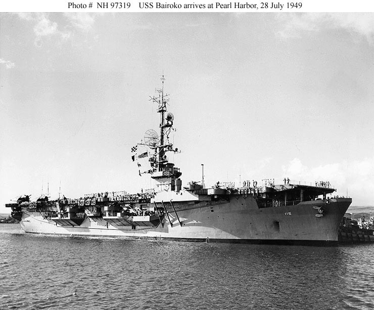 109k | "The 10,900 ton escort aircraft carrier, USS Bairoko, is shown as she arrived at Pearl Harbor Thursday evening, July 28 (1949), from San Diego, Calif., with 30 officers and 150 enlisted personnel from Composite Squadron 25, which will receive six weeks' training with Fleet All Weather Training Unit at Barber's Point Naval Air Station, Oahu, T.H. The Bairoko is commanded by Captain S. Gazze, USN, of Coronado, California". Quoted from the original picture caption, released by 14th Naval District Public Information Office on 29 July 1949. Official U.S. Navy Photograph, from the collections of the Naval Historical Center (# NH 97319). |
