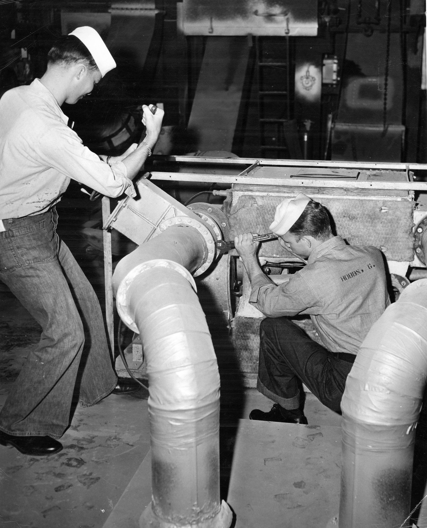 510k | "Everybody turns to when it's reactivation time. Here storekeeper striker D.W. Shore ... and Glenn Hobbs ... remove a dehumidifier from the hangar deck of USS Bairoko prior to its actual reactivation by San Francisco Naval Shipyard employees." "Navy men like Seaman Hobbs and Storekeeper Shore were given the task of helping in reassembling the ship that would be theirs when the ship departed from San Francisco." Quoted caption was released with this photo circa August 1950. Bairoko recommissioned for Korean War service on 12 September 1950. Official U.S. Navy Photograph, from the All Hands collection at the Naval History & Heritage Command (NHHC), # NH 97004. |