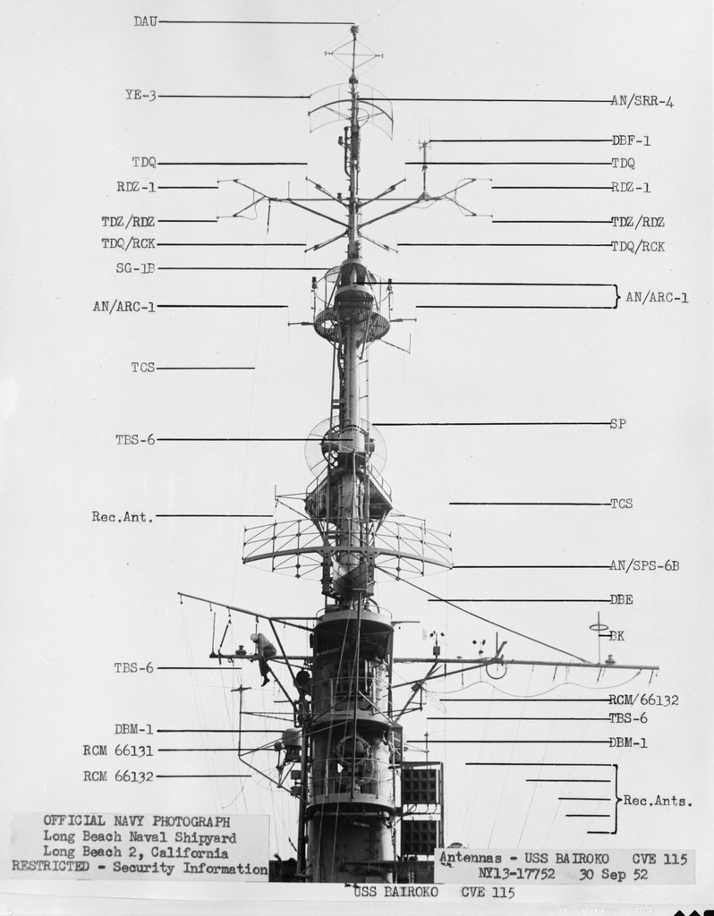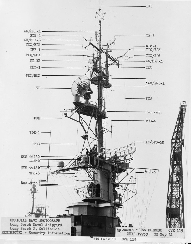 107k | NY13-17752, USS Bairoko (CVE-115), Antennas - 30 September 1952. Long Beach Naval Shipyard, Long Beach 2, California. Official Navy Photograph. National Archives and Records Administration (NARA), photo # rg19nn-b1584-006-041_pr, from Record Group 19. |