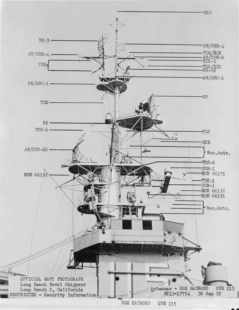 131k | NY13-17753, USS Bairoko (CVE-115), Antennas - 30 September 1952. Long Beach Naval Shipyard, Long Beach 2, California. Official Navy Photograph. National Archives and Records Administration (NARA), photo # rg19nn-b1584-006-042_pr, from Record Group 19. |