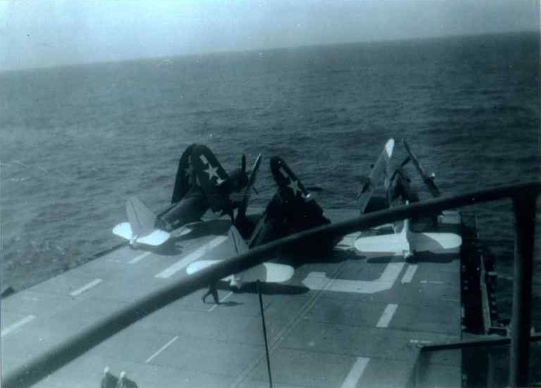 111k | Photos from the collection of Frank J. White, USS Bairoko (CVE-115), 1944–1945. F4U Corsairs on deck. |