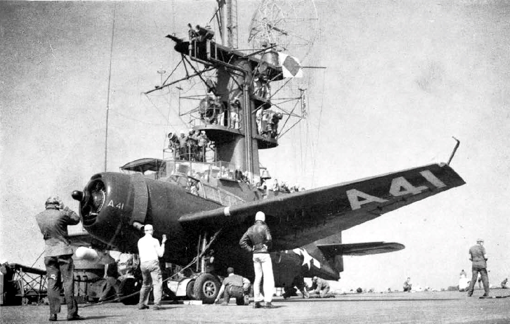 390k | A U.S. Navy Grumman TBM-3 Avenger aboard the escort carrier USS Bairoko (CVE-115), circa 1945. U.S. Navy photo from the Bairoko 1946 Cruise Book. |