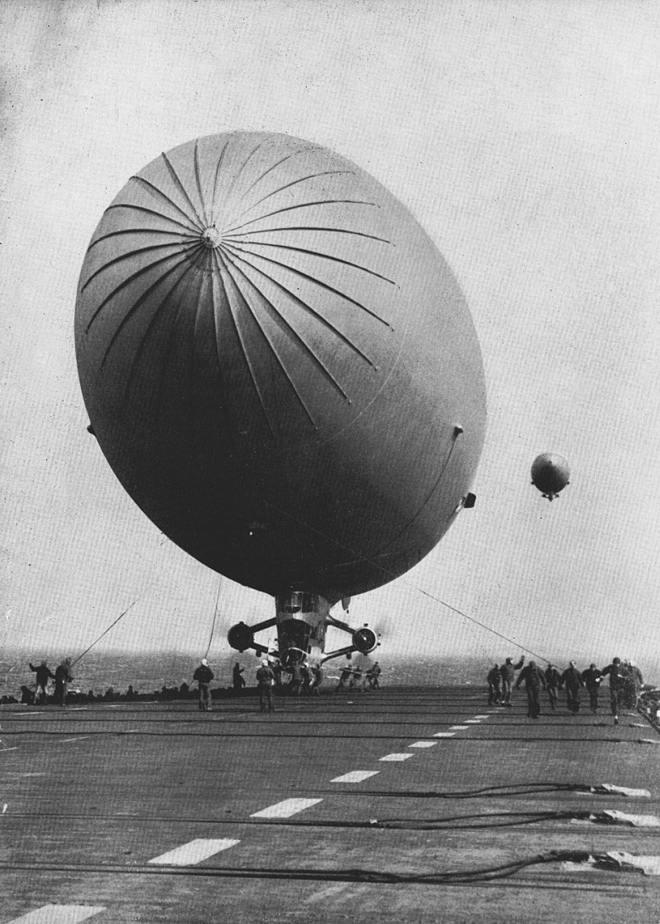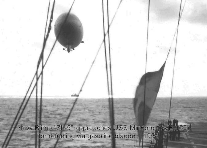 31k | Navy blimp ZL-5 approaches USS Mindoro (CVE-120) for refueling via gasoline bladder, 1954. |