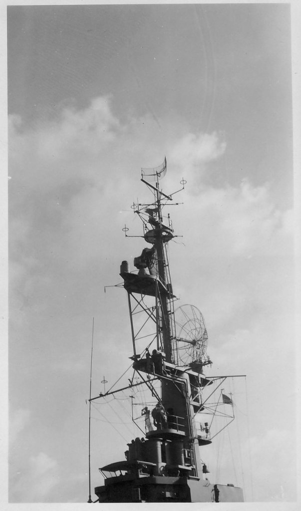 63k | Dale is not sure where the ship was when he shot this photo, circa spring 1946. The reason he took it is that he was trying to show how the mast was damaged or repaired. He was an RM1c when, according to his memory, USS Mindoro (CVE-120) sailed beneath a bridge somewhere on the west coast that was a little too low for the ship to pass under. Dale thought it was the Golden Gate bridge, but his memory is hazy on that part of the story. The main thing he remembers is the havoc it wreaked in the radio room. Correction from Dr. James L. West, Princeton, NJ: "USS Mindoro sailed under and struck the Brooklyn bridge on Feb. 22, 1946. The accident caused extensive damage to the radar mast, and broke water mains and electrical lines on the bridge. The ship was headed to the Brooklyn Navy Yard at the time. My dad, CDR James A. West Jr., Air Officer aboard the Mindoro at the time, often recounted this incident." |