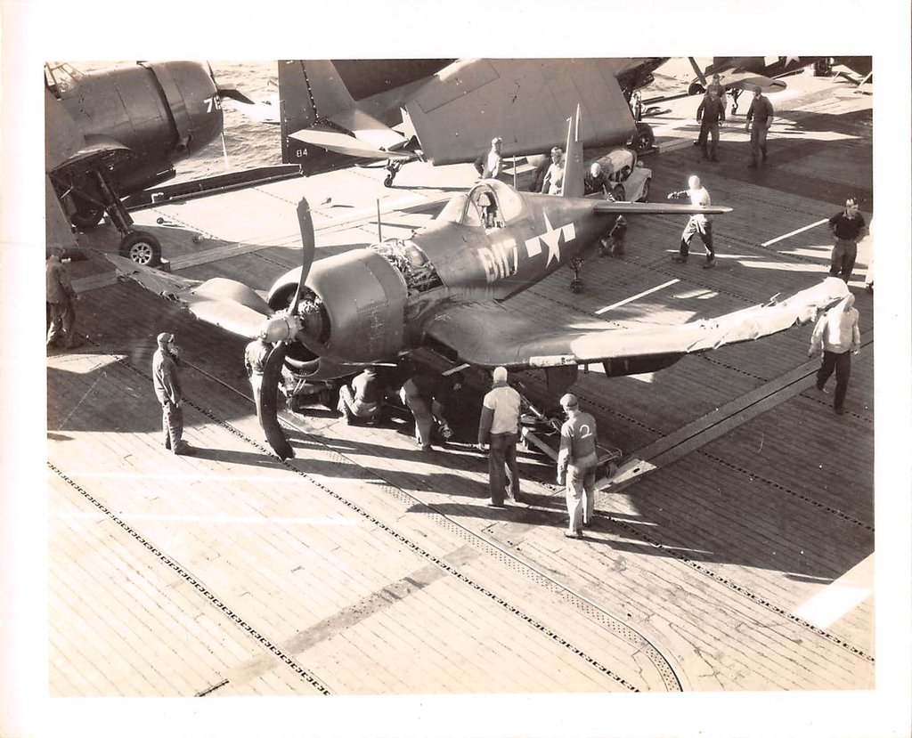 120k | Flight deck activity aboard USS Mindoro (CVE-120), circa 1946. Avenger, side number F82, launching. A damaged Corsair, side number B117. From the collection of Gerard Nicolais, Charlie's father-in-law. |