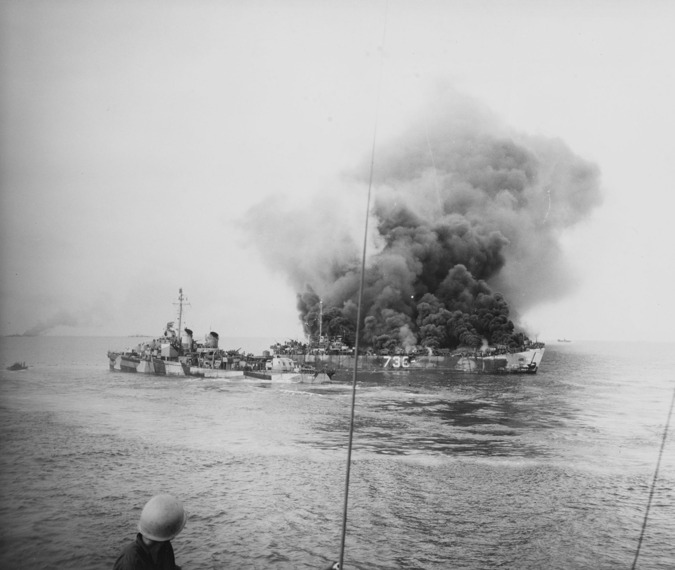 57k | CVE-120 was named Mindoro after the seventh largest island in the Philippines by land area. The island is located off the southwestern coast of Luzon and northeast of Palawan (NS0312028). During World War II the island was the location of the Battle of Mindoro, 13–16 December 1944. US forces made an amphibious landing on Mindoro and defeated Japanese forces there. There was no significant Japanese opposition, except for kamikaze attacks on American ships. NS0569307: USS Moale (DD-693), CDR Walter M. Foster, valiantly stands alongside the burning LST-738 (loaded with aviation fuel and ordnance) to rescue crewmembers. LST-738 was hit by a kamikaze, 15 December 1944. Note hole in LST-738's starboard side, just forward of the large "738" painted there. Smoke in the left distance may be from LST-472, which was also hit by the Kamikaze attack. Moale is painted in camouflage Measure 32, Design 9D. Collection of Admiral Thomas C. Kinkaid, USN. U.S. Naval History & Heritage Command photo, # NH 95259, via Joe Radigan. Two previous US ships had been named for the island: