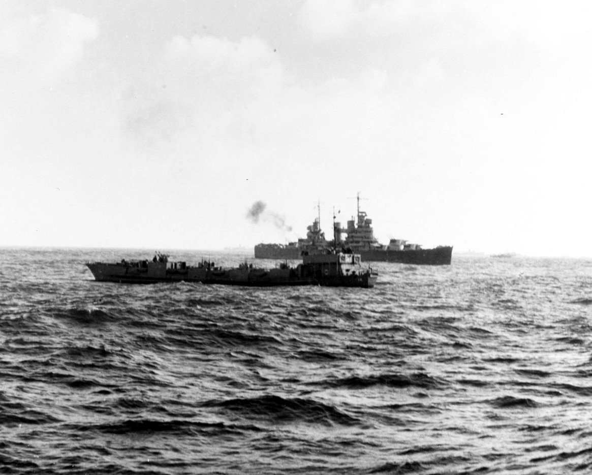 HM LCF(3)-14 is in the foreground as USS Brooklyn (CL 40) bombarding during the initial landing at Anzio, 22 January 1944. Photographed from USS Frederick C. Davis (DE 136). US National Archives, Photo #80-G-223490, a US Navy photo now in the collections of the US Naval History and Heritage Command |