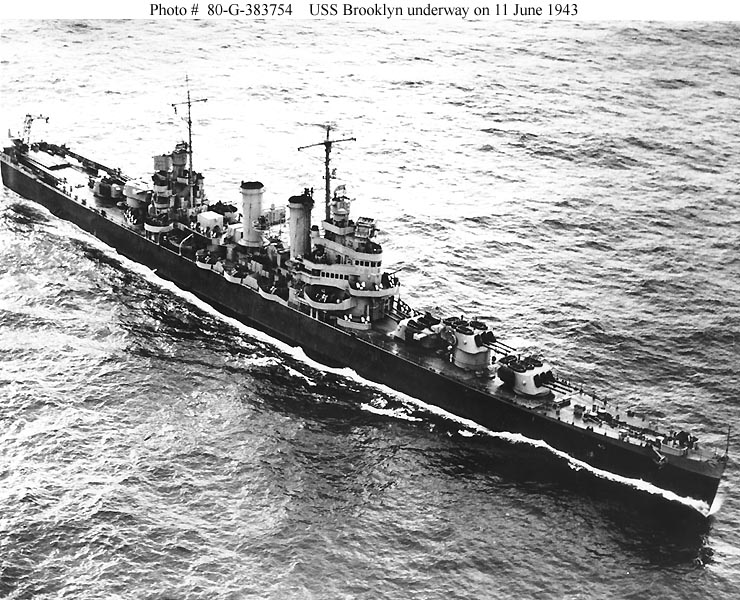 USS Brooklyn (CL 40) Underway on 11 June 1943. Photographed by Fleet Air Wing Nine. Official U.S. Navy Photograph, now in the collections of the National Archives - 80-G-383754. |