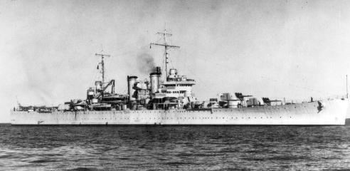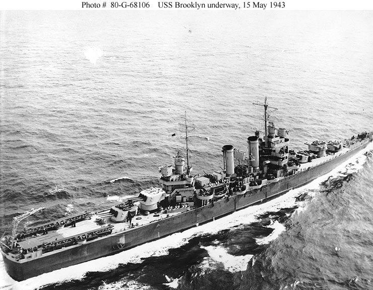 USS Brooklyn (CL 40) Underway at sea, 15 May 1943. Photographed from an aircraft based as Naval Air Station Weeksville, North Carolina. Official U.S. Navy Photograph, now in the collections of the National Archives - 80-G-68106. |