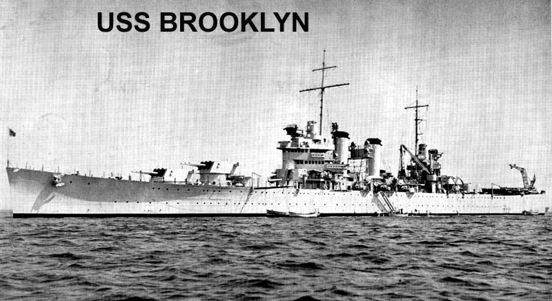 USS Brooklyn (CL 40) Anchored in the Hudson River, off New York City, 1939. The Palisade Amusement Park is in the left background, beyond Brooklyn's aircraft crane. Donation of Lieutenant Gustave J. Freret, USN (Retired), 1972. U.S. Naval Historical Center Photograph - NH 81262. |
