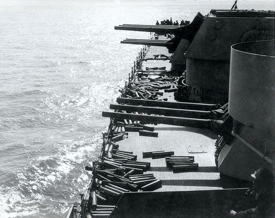 Invasion of Sicily, July 1943 - Empty shell cases litter the deck near the forward 6"/47 gun turrets of USS Brooklyn (CL 40), after she had bombarded Licata, Sicily, during the early hours of the invasion, 10 July 1943. Official U.S. Navy Photograph, now in the collections of the National Archives - 80-G-42522. |