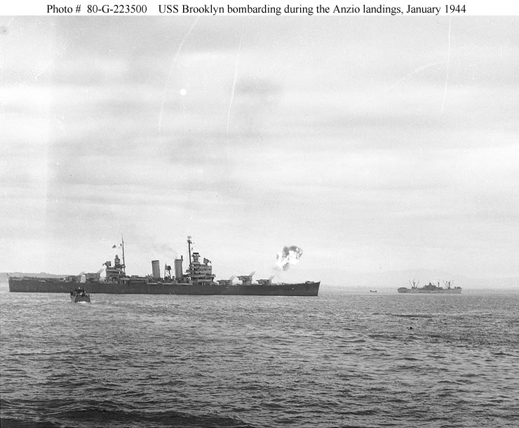 109k | Anzio Campaign, 1944 - USS Brooklyn (CL 40) bombarding with her 6"/47 guns, during the landings at Anzio, Italy, 22 January 1944. Photographed from USS Frederick C. Davis (DE 136). Official U.S. Navy Photograph, now in the collections of the National Archives - 80-G-223500. |