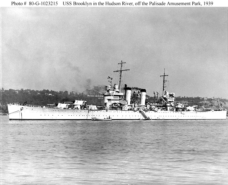 USS Brooklyn (CL 40) in the Hudson River, off New York City, 1939. The Palisade Amusement Park is in the center background. Official U.S. Navy Photograph, now in the collections of the National Archives - 80-G-1023215. |