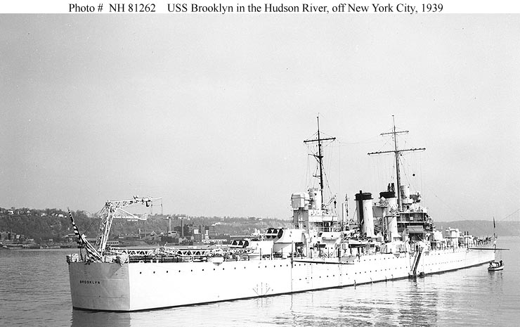 USS Brooklyn (CL 40) Anchored in the Hudson River, off New York City, 1939. Donation of Lieutenant Gustave J. Freret, USN (Retired), 1972. U.S. Naval Historical Center Photograph - NH 81189. |