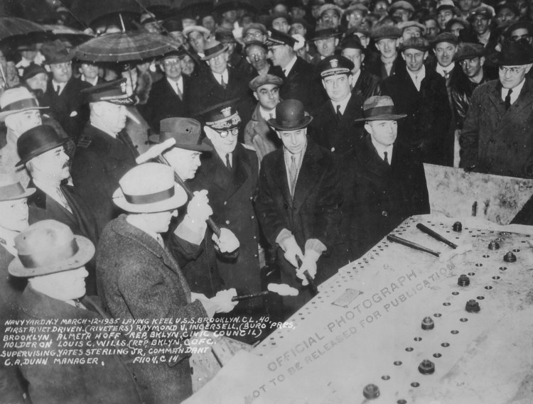 Caption from photo: "Navy Yard N.Y., March-12-1935 Laying keel USS. Brooklyn, CL.40, First rivet driven. (Riveters) Raymond V. Ingersell. (Buro Pres, Brooklyn, Almetr Hoff Rep, Bklyn, Civic Council) Holder on Louis C. Wills (Rep, Bklyn COFC. Supervising. Yates Sterling Jr, Commandant G.A. Dunn Manager. F1104-C-14" |