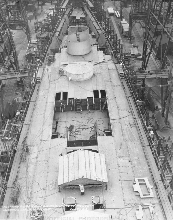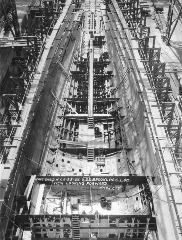 Caption from photo: "Navy Yard N.Y., 3-8-35 - U.S.S. Brooklyn, CL.40. Section of keel as fabricated showing shell plates connected before being installed F1104-C-10" |