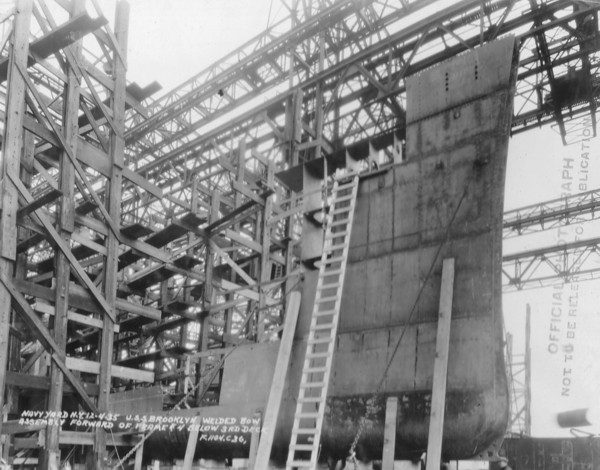 Caption from photo: "Navy Yard N.Y. 12-4-35 U.S.S. Brooklyn welded bow assembly forward of frame 4 and below 3rd deck F1104-C-36." |