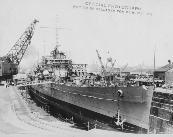 33k | Starboard bow view of ex USS Brooklyn at the Philadelphia Navy Yard before commissioning in Chilean Navy, 12 July 1951. | Pedro Carrasco Bravo. | |