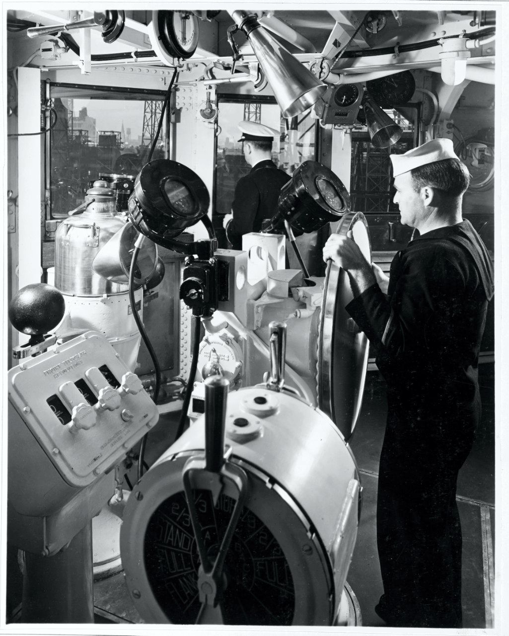 232k | Helmsman at the wheel on the bridge, 18 January 1938. NHHC Photo #NH 56617 |