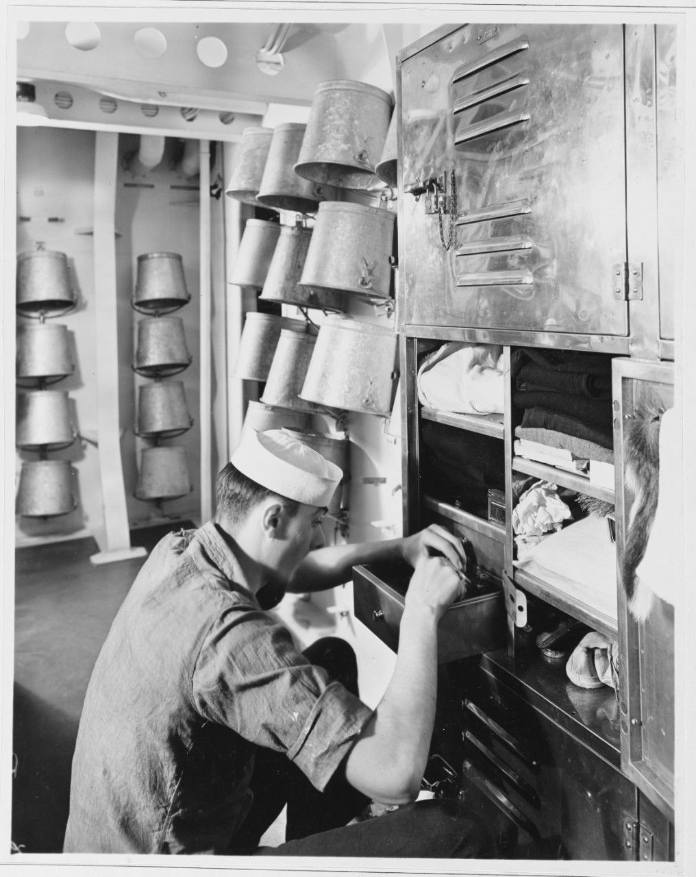 189k | Enlisted crewman's storage locker in use, 18 January 1938. Note galvanized steel washing buckets hung on the bulkheads in the background. NHHC Photo #NH 56616 |