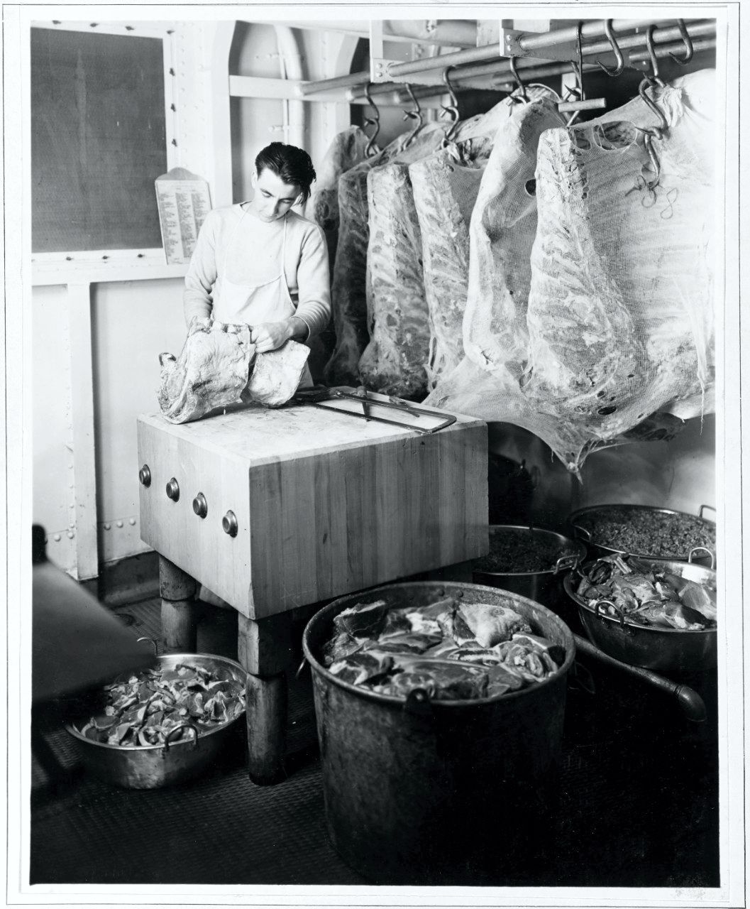 226k | Preparation of meat in the reefer room, 18 January 1938. | NHHC | |