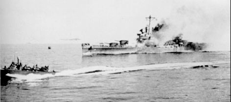 USS Savannah (CL 42) Afire and beginning to settle by the bow, very soon after she was hit by a German guided bomb during the Salerno operation, 11 September 1943. The bomb penetrated the top of the ship's number three 6"/47 gun turret, which is in the center of this photograph with smoke over it. Photograph from the Army Signal Corps Collection in the U.S. National Archives - SC 364342 |